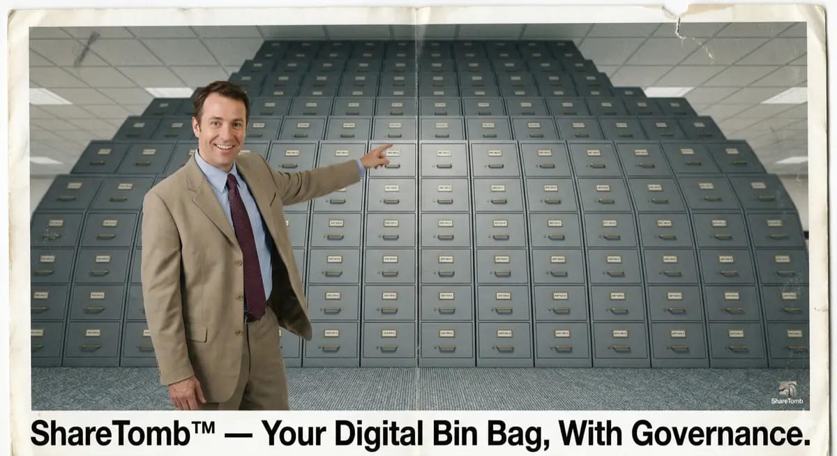 ShareTomb™ is where information goes to fulfil its final purpose: existing, technically, somewhere, in a folder structure last updated by someone who no longer works here.