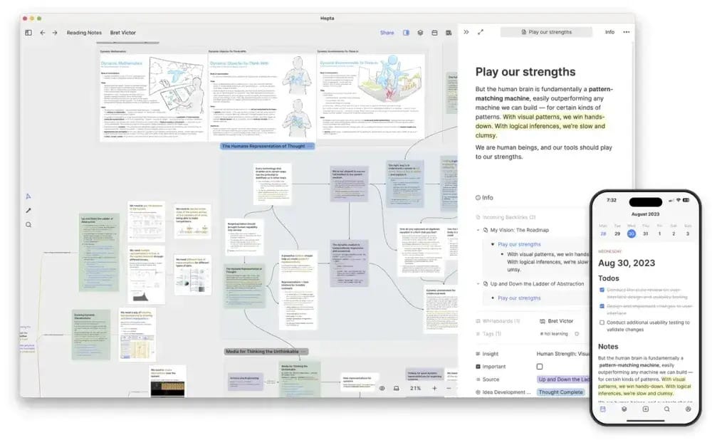 Heptabase is designed with visual thinkers in mind, offering an innovative approach to note-taking that excels in PKM and research. Its interactive boards provide a visually engaging way to organise ideas and notes, making it an ideal tool for people who manage large volumes of information.